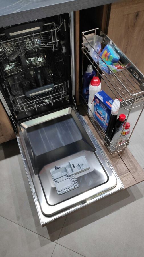 Когда нужны и посудомойка, и бутылочница, а городить забор из узких фасадов нет никакого желания, мы найдем выход даже в такой ситуации. За одним фасадом спрятали все, что нужно для идеально чистой посуды, не нарушая гармонии, царящей на кухне и в душе хозяйки.