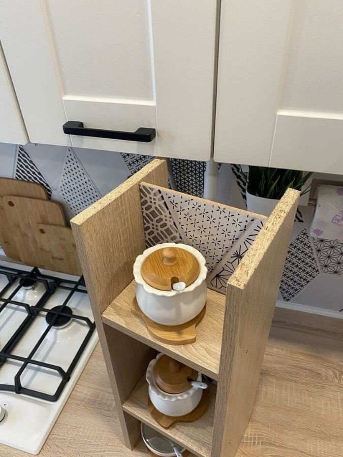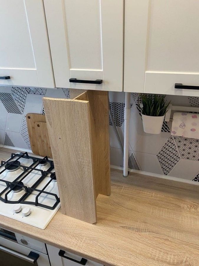 Чтобы газовая труба не портила общий дизайн кухни, ее можно спрятать. Для этого надо сделать маленькую полку. Практичное и симпатичное решение.